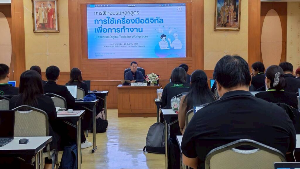 วันที่ 24 – 26 ธันวาคม 2568 นายธนดล วงษ์ขันธ์ เกษตรจังหวัดกำแพงเพชร มอบหมายให้นายกิตติ โพธิ์จวง นักวิชาการส่งเสริมการเกษตรชำนาญการ กลุ่มยุทธศาสตร์และสารสนเทศ เข้าร่วมการอบรมหลักสูตร “การใช้เครื่องมือดิจิทัลเพื่อการทำงาน (Essential Digital Tools for Workplace)” โดยเน้นการเรียนรู้และฝึกปฏิบัติจริงผ่านกิจกรรมต่างๆ ที่ออกแบบมาเพื่อเสริมสร้างทักษะการใช้เครื่องมือดิจิทัลสำคัญ อาทิเช่น ระบบจัดการเอกสารดิจิทัล เครื่องมือสื่อสารออนไลน์ และการประยุกต์ใช้ AI เบื้องต้นสำหรับการช่วยงานด้านข้อมูล เพื่อยกระดับทักษะและการนำเทคโนโลยีดิจิทัล รวมถึง ปัญญาประดิษฐ์ (AI) มาใช้สนับสนุนการปฏิบัติงานของบุคลากรของหน่วยงานให้ทันต่อการเปลี่ยนแปลงของยุคดิจิทัลและตอบโจทย์การบริหารราชการยุคใหม่อย่างมีประสิทธิภาพ ณ ห้องประชุม 7 ชั้น 5 อาคาร 1 กรมส่งเสริมการเกษตร โดยมีนายวีรศักดิ์ บุญเชิญ รองอธิบดีกรมส่งเสริมการเกษตร ให้เกียรติเป็นประธานในพิธีเปิดการฝึกอบรม