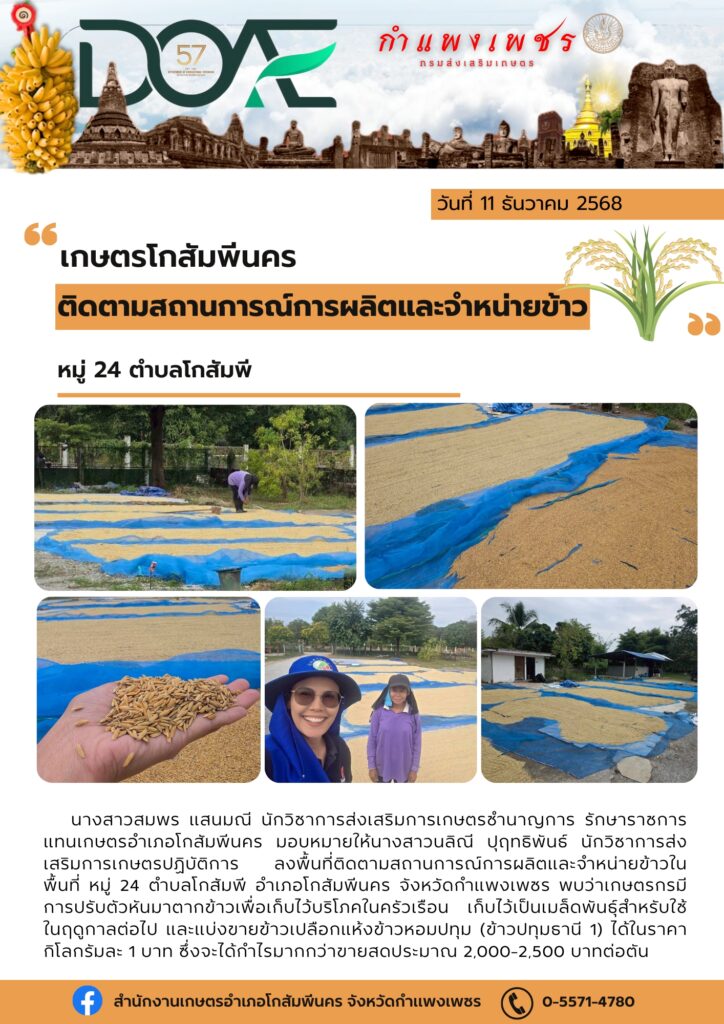 นางสาวสมพร แสนมณี นักวิชาการส่งเสริมการเกษตรชำนาญการ รักษาราชการแทนเกษตรอำเภอโกสัมพีนคร มอบหมายให้นางสาวนลิณี​ ปุฤทธิพันธ์​ นักวิชาการส่งเสริมการเกษตรปฏิบัติการ ลงพื้นที่ติดตามสถานการณ์การผลิตและจำหน่ายข้าวในพื้นที่ หมู่ 24 ตำบลโกสัมพี อำเภอโกสัมพีนคร จังหวัดกำแพงเพชร พบว่าเกษตรกรมีการปรับตัวหันมาตากข้าวเพื่อเก็บไว้บริโภคในครัวเรือน เก็บไว้เป็นเมล็ดพันธุ์สำหรับใช้ในฤดูกาลต่อไป และแบ่งขายข้าวเปลือกแห้งข้าวหอมปทุม (ข้าวปทุมธานี 1) ได้ในราคากิโลกรัมละ 1 บาท ซึ่งจะได้กำไรมากกว่าขายสดประมาณ 2,000-2,500 บาทต่อตัน