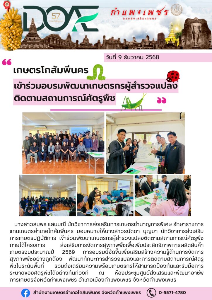 นางสาวสมพร แสนมณี นักวิชาการส่งเสริมการเกษตรชำนาญการพิเศษ รักษาราชการแทนเกษตรอำเภอโกสัมพีนคร มอบหมายให้นางสาวธนัดดา บุญมา นักวิชาการส่งเสริมการเกษตรปฏิบัติการ เข้าร่วมพัฒนาเกษตรกรผู้สำรวจแปลงติดตามสถานการณ์ศัตรูพืช ภายใต้โครงการ ส่งเสริมการจัดการสุขภาพพืชเพื่อเพิ่มประสิทธิภาพการผลิตสินค้าเกษตรงบประมาณปี 2569 การอบรมนี้จัดขึ้นเพื่อเสริมสร้างความรู้ด้านการจัดการสุขภาพพืชอย่างถูกต้อง พัฒนาทักษะการสำรวจแปลงและการติดตามสถานการณ์ศัตรูพืชในระดับพื้นที่ รวมถึงเตรียมความพร้อมเกษตรกรให้สามารถป้องกันและรับมือการระบาดของศัตรูพืชได้อย่างทันท่วงที ณ ห้องประชุมศูนย์ส่งเสริมและพัฒนาอาชีพการเกษตรจังหวัดกำแพงเพชร อำเภอเมืองกำแพงเพชร จังหวัดกำแพงเพชร