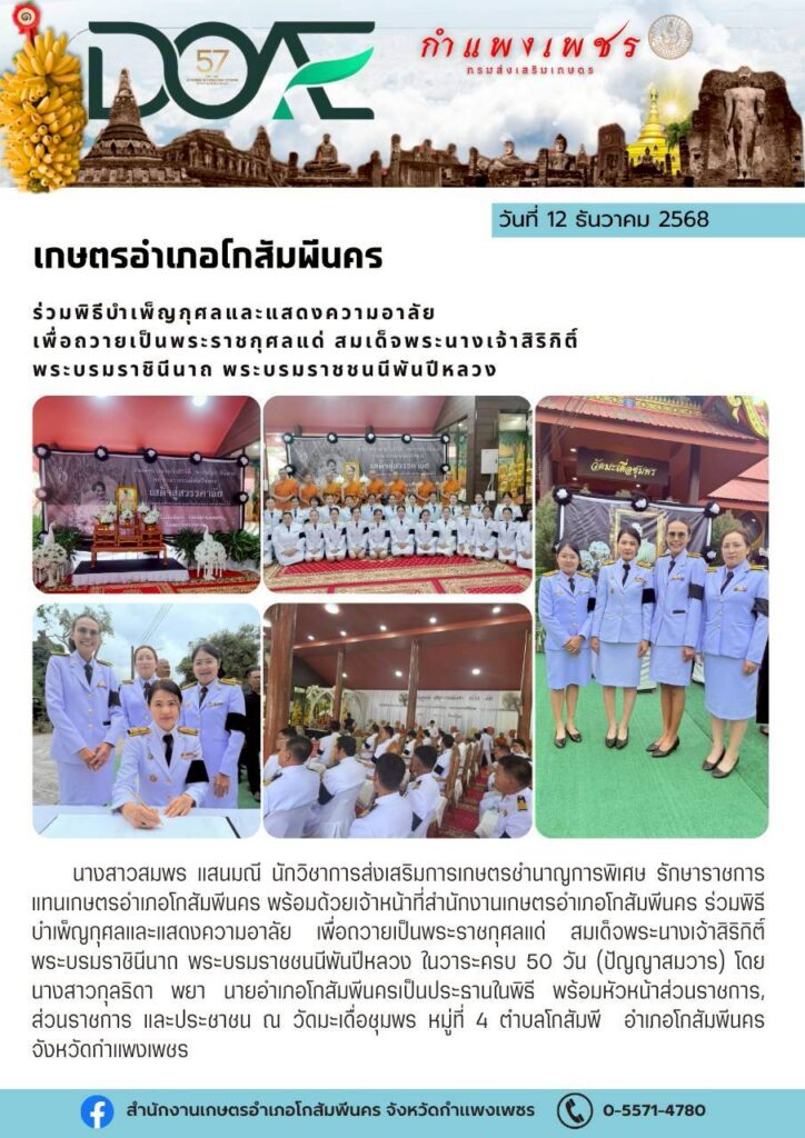 นางสาวสมพร แสนมณี นักวิชาการส่งเสริมการเกษตรชำนาญการพิเศษ รักษาราชการแทนเกษตรอำเภอโกสัมพีนคร พร้อมด้วยเจ้าหน้าที่สำนักงานเกษตรอำเภอโกสัมพีนคร ร่วมพิธีบำเพ็ญกุศลและแสดงความอาลัย เพื่อถวายเป็นพระราชกุศลแด่ สมเด็จพระนางเจ้าสิริกิติ์ พระบรมราชินีนาถ พระบรมราชชนนีพันปีหลวง ในวาระครบ 50 วัน (ปัญญาสมวาร) โดยนางสาวกุลธิดา พยา นายอำเภอโกสัมพีนครเป็นประธานในพิธี พร้อมหัวหน้าส่วนราชการ, ส่วนราชการ และประชาชน ณ วัดมะเดื่อชุมพร หมู่ที่ 4 ตำบลโกสัมพี อำเภอโกสัมพีนคร จังหวัดกำแพงเพชร