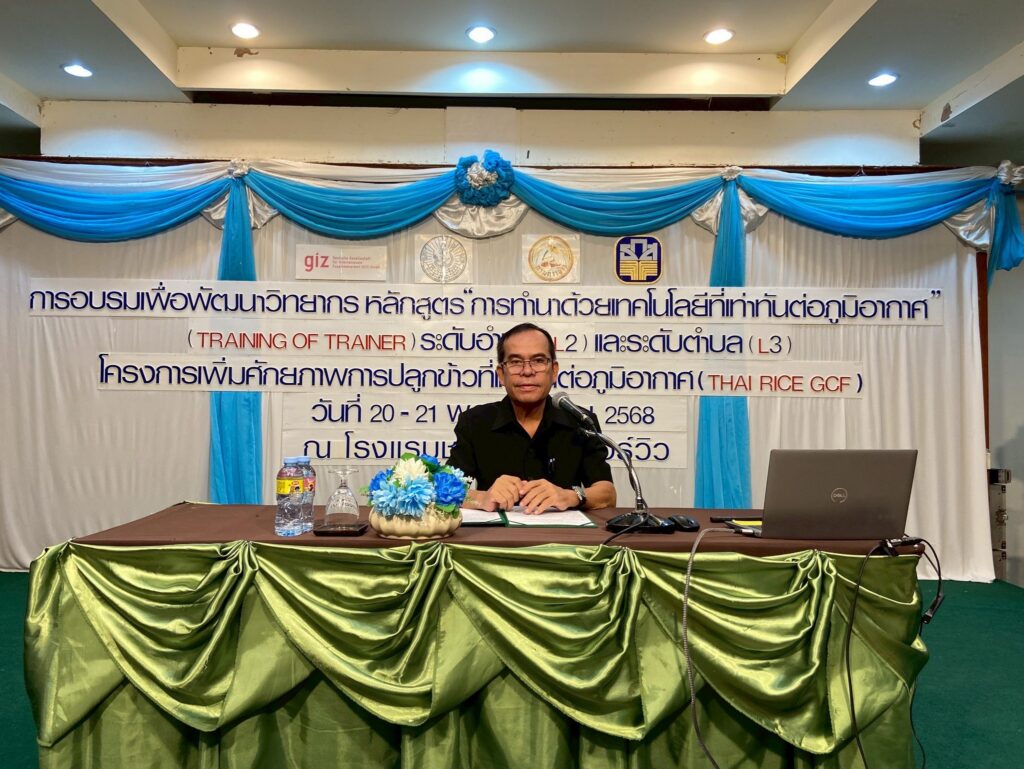 วันที่ 20 -21 พฤศจิกายน 2568 เวลา 09.10 น. นายธนดล วงษ์ขันธ์ เกษตรจังหวัดกำแพงเพชร เป็นประธานเปิดงาน การอบรมเพื่อพัฒนาวิทยากรหลักสูตรการทำนาด้วยเทคโนโลยีที่เท่าทันต่อภูมิอากาศ ระดับอำเภอ (L2) และตำบล(L3) จังหวัดกำแพงเพชร ภายใต้โครงการเพิ่มศักยภาพการปลูกข้าวที่เท่าทันต่อภูมิอากาศ (Thai Rice GCF) โดยมีวัตถุประสงค์ เพื่อยกระดับการพัฒนาเจ้าหน้าที่ให้เป็นวิทยากรที่มีความรู้ และสามารถถ่ายทอดความรู้ การปลูกข้าวด้วยเทคโนโลยีที่เท่าทันต่อภูมิอากาศ ได้อย่างมีประสิทธิภาพ ทั้งนี้ มีเจ้าหน้าที่จากหน่วยงานภาคี ได้แก่ กรมส่งเสริมการเกษตรจังหวัดกำแพงเพชร กรมการข้าวจังหวัดกำแพงเพชร ธนาคารเพื่อการเกษตรและสหกรณ์การเกษตร จังหวัดกำแพงเพชร และองค์กรความร่วมมือระหว่างประเทศของเยอรมัน รวมทั้งท่านไพรัช หวังดี อดีตรองอธิบดีกรมส่งเสริมการเกษตรและที่ปรึกษาโครงการ เข้าร่วมแลกเปลี่ยน และร่วมหาแนวทางการพัฒนา และขับเคลื่อนโครงการ ดังกล่าว โดยมีผู้เข้าร่วมงานทั้งสิ้นจำนวน 100 ราย ณ โรงแรมชากังราว อ.เมืองกำแพงเพชร จ.กำแพงเพชร