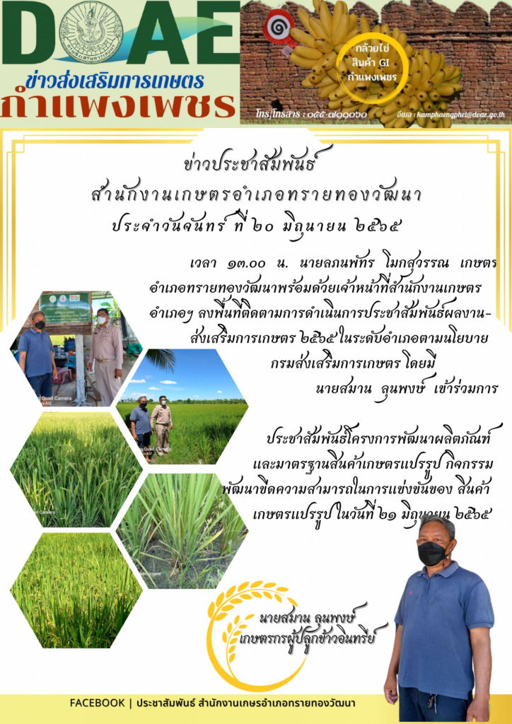 เวลา ๑๓.๐๐ น. นายลภนพัทร โมกสุวรรณ เกษตรอำเภอทรายทองวัฒนาพร้อมด้วยเจ้าหน้าที่สำนักงานเกษตรอำเภอฯ ลงพื้นที่ติดตามการดำเนินการประชาสัมพันธ์ผลงาน-ส่งเสริมการเกษตร ๒๕๖๕ ในระดับอำเภอตามนโยบายกรมส่งเสริมการเกษตร โดยมีนายสมาน ลุนพงษ์ เข้าร่วมการประชาสัมพันธ์โครงการพัฒนาผลิตภัณฑ์และมาตรฐานสินค้าเกษตรแปรรูป กิจกรรมพัฒนาขีดความสามารถในการแข่งขันของ สินค้าเกษตรแปรรูป ในวันที่ ๒๑ มิถุนายน ๒๕๖๕
